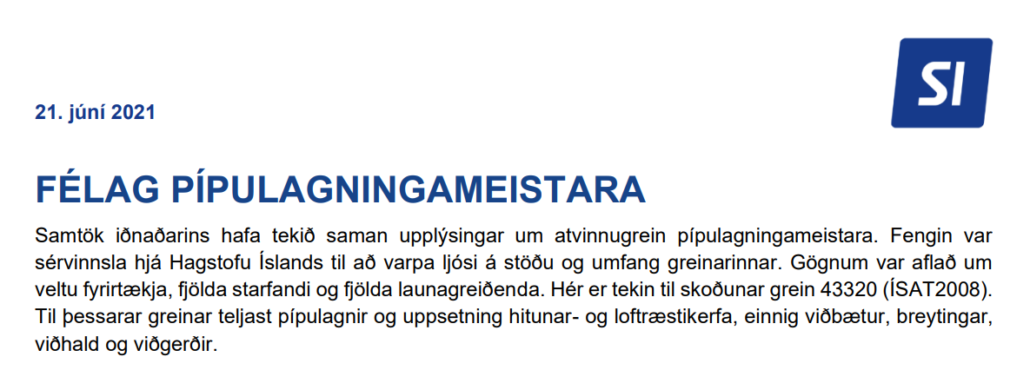 Samtök iðnaðarins tóku saman gögn varðandi veltu fyrirtækja í pípulögnum og uppsetningu hitunar- og loftræstikerfa fyrir árið 2020.